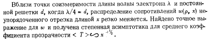 Вблизи точки соизмеримости длины волны электрона λ и постоянной решетки d, когда λ/4 = d, распределение сопротивлений w(pp χ) неупорядоченного отрезка длиной χ резко меняется. Найдено точное выражение для w и по,лучена степенная асимптотика для среднего коэффициента прозрачности < Τ >*οχ * /г.