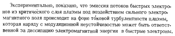 Экспериментально, показано, что эмиссия потоков быстрых электронов из критического слоя плазмы под воздействием сильного электромагнитного поля происходит на фоне токовой турбулентности цлазмы, которая наряду с модуляционной неустойчивостью может быть ответственной за диссипацию электромагнитной энергии в быстрые электроны.