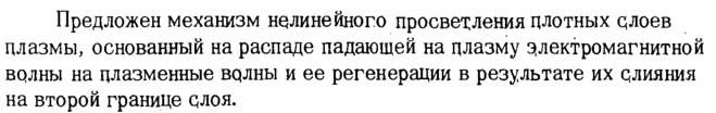 Предложен механизм нелинейного просвет;ления плотных qлoeв плазмы, основанный на распаде падающей на цлазму электромагнитной врлны на плазменные врлны и ее регенерации в результате их слияния на второй границе рлоя.