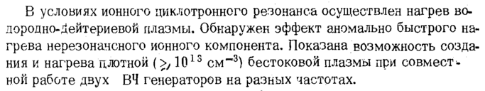 В условиях ионного циклотронного резонанса осуществлен нагрев во-дородно-Дейтериевой плазмы. Обнаружен эффект аномально быстрого нагрева нерезонансного ионного компонента. Показана возможность создания и нагрева плотной (>у 1013 см"3) бестоковой плазмы при совместной работе двух ВЧ генераторов на разных частотах.