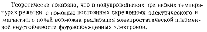 Теоретически показано, что в полупроводниках при низких температурах решетки с помощью постоянных скрещенных электрического и магнитного полей возможна реализация электростатической плазменной неустойчивости фотовозбужденных электронов.