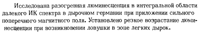 Исследована разогревная люминесценция в интегральной области далекого ИК спектра в дырочном германии при приложении сильного поперечного магнитного поля. Установлено резкое возрастание люминесценции при возникновении ловушки в зоне легких дырок.