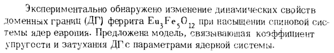 Экспериментально обнаружено изменение динамических свойств доменных границ (ДГ) феррита Eu3Fe5012 при насыщении спиновой системы ядер европия. Предложена модель, связывающая коэффициент упругости и затухания ДГс параметрами ядерной системы.