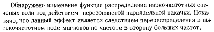 Обнаружено изменение функции распределения низкочастотных спиновых волн под действием нерезонансной параллельной накачки. Показано, что данный эффект является следствием перераспределения в высокочастотном поле магнонов по частоте з сторону больших частот.