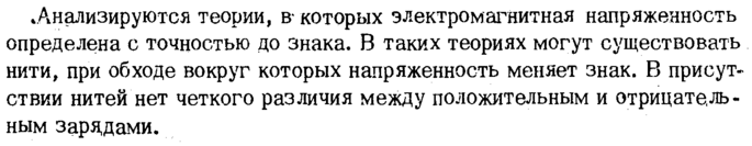 ^Анализируются теории, вкоторых электромагнитная напряженность определена с точностью до знака. В таких теориях могут существовать нити, при обходе вокруг которых напряженность меняет знак. В присутствии нитей нет четкого различия между положительным и отрицательным зарядами.