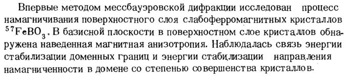 Впервые методом мессбауэровской дифракции исследован процесс намагничивания поверхностного слоя слабоферромагнитных кристаллов 57FeB03„ В базисной плоскости в поверхностном слое кристаллов обнаружена наведенная магнитная анизотропия. Наблюдалась связь энергии стабилизации доменных границ и энергии стабилизации направ;ления намагниченности в домене со степенью совершенства кристаллов.