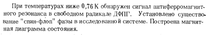 При температурах ниже 0,76 К обнаружен сигнал антиферромагнитного резонанса в свободном радикале ДФПГ. Установлено существование "спин-флоп" фазы в исследованной системе. Построена магнитная диаграмма состояния.