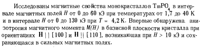 Исследованы магнитные свойства монокристаллов ТтР04 в интервале магнитных полей Я от 0 до 60 кЭ при температурах от 1,7 до 40 К и в интервале Я от 0 до 130 кЭ при Τ = 4,2 К. Впервые обнаружена, анизотропия магнитного момента М(Н) в базисной плоскости кристалла при ориентациях Η | | [100 ] и Η )| [ПО ], возникающая при Η > 10 кЭ и сохраняющаяся в сильных магнитных прлях.
