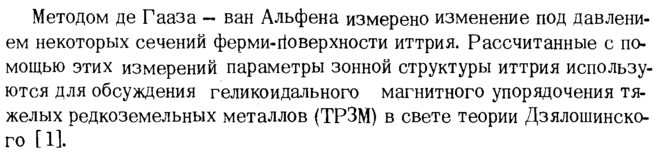 Методом де Гааза ван Альфена измерено изменение под давлением некоторых сечений ферми-йоверхности иттрия* Рассчитанные с помощью этих измерений параметры зонной структуры иттрия используются для обсуждения геликоидального магнитного упорядочения тяжелых редкоземельных металлов (ТРЗМ) в свете теории Дзялошинско-го [1].