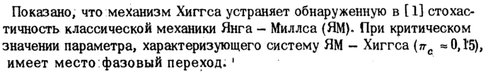 Показано, что механизм Хиггса устраняет обнаруженную в [1] сто хаотичность классической механики Янга Миллса (ЯМ). При критическом значении параметра, характеризующего систему ЯМ Хиггса (пс «0,15), имеет место фазовый переход. '