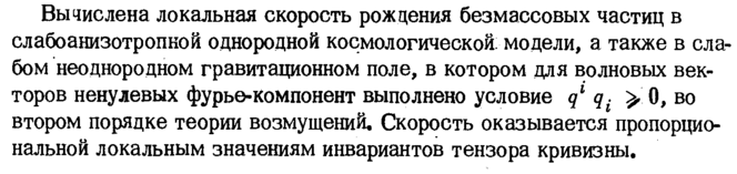 Вычислена локальная скорость рождения безмассовых частиц в слабоанизотропкой однородной космологической: модели, а также в слабом неоднородном гравитационном поле, в котором для волновых векторов ненулевых фурье-компонент выполнено условие ql qi > 0, во втором порядке теории возмущений. Скорость оказывается пропорциональной локальным значениям инвариантов тензора кривизны.