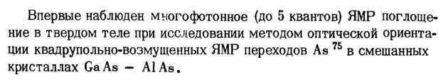 Впервые наблюден многофотонное (до 5 квантов) ЯМР поглощение в твердом теле при исследовании методом оптической ориентации квадрупольно-возмущенных ЯМР переходов As 75 в смешанных кристаллах Ga As — ΑΙ As.