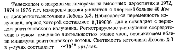 Телескопом с искровыми камерами на высотных аэростатах в 1972, 1974 и 1976 г.г\ Измерены потоки у-квантов с энергией больше 40 Мэв от дискретного,источника Лебедь Х-3. Наблюдается переменность излучения, период которой составляет 0,199686 дня и совпадает с периодом рентгеновского излучения. Регистрируемое у-излучение сосредоточено в узком импульсе длительностью менее часа, возникающем вблизи минимума рентгеновского потока. Светимость источника Лебедь Х-3 в у-лучах составляет ~Ί038 эрг/сек.