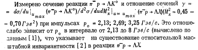 Измерено сечение реакции π~ ρ ^ АК° и отношение сечений γ = = da/du\u (n-p-+AK0)/d2o/dudM2x\u=:u :(п~р+ШМ2 = 0,45 - max max x 0,70Гэв2) при импульсах р0 = 2,13; 2,69; 3,25 Гэв/с. Это отноше-слабо зависит от ро в интервале от 2,13 до 8 Гэв/с (вычислено по данным [ 1]), что указывает на существование относительной масштабной инвариантности [2] в реакции я*р -> АХ.