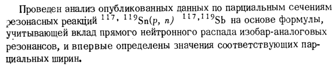 Проведен анализ опубликованных данных по парциальным сечениям резонасных реакций 117» 119Sn(p, η) 117'119Sb на основе формулы, учитывающей вклад прямого нейтронного распада изобар-аналоговых резонансов, и впервые определены значения соответствующих парциальных ширин.