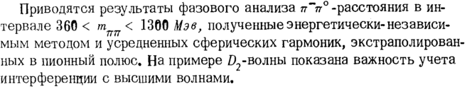 Приводятся результаты фазового анализа π~π° -расстояния в интервале 360 < т < 1300 Мэв, полученные энергетически-независимым методом и усредненных сферических гармоник, экстраполированных в пионный полюс. На примере 02-волны показана важность учета интерференции с высшими волнами.