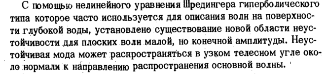С помощью нелинейного уравнения Шредингера гиперболического типа которое часто используется для описания волн на поверхности глубокой воды, установлено существование новой области неустойчивости для плоских волн малой, но конечной амплитуды. Неустойчивая мода может распространяться в узком телесном угле около нормали к направлению распространения основной волны. 1