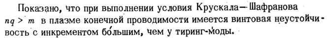 Показано, 4το при выполнении условия Крускала— Шафранова nq> т в плазме конечной проводимости имеется винтовая неустойчивость с инкрементом большим, Чем у тиринг-^оды.