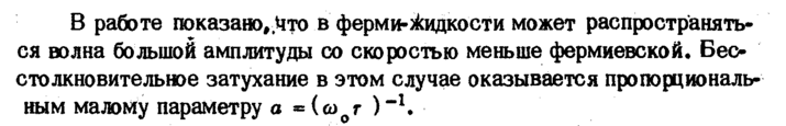 В работе показано, *™ в ферми-Жидкости может распространяться волна большой амплитуды со скоростью меньше фермиевской. Бео стожновительное затухание в этом случае оказывается пропорциональным малому параметру о * (ω г )"Ч