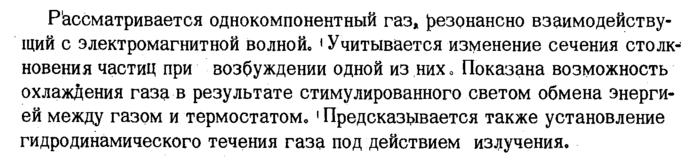 Рассматривается однокомпонентный газ, резонансно вз^имодейству-щий с электромагнитной волнойс 1 Учитывается изменение сечения столкновения частиц при возбуждении одной из них. Показана возможность охлаждения газа в результате стимулированного светом обмена энергией между газом и термостатом» 1 Предсказывается также установление гидродинамического течения газа под действием излучения.