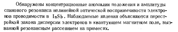 Обнаружены концентрационные аномалии положения и амплитуды спинового резонанса нелинейной оптической восприимчивости электронов проводимости в InSb» Наблюдаемые явления объясняются перестройкой закона дисперсии электронов в квантующем магнитном поле, вызванной резонансным рассеянием на примесях.