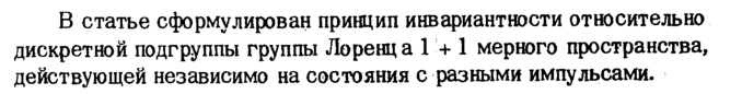 В статье сформулирован принцип инвариантности относительно дискретной подгруппы группы Лоренц а 1 + 1 мерного пространства, действующей независимо на состояния с разными импульсами.