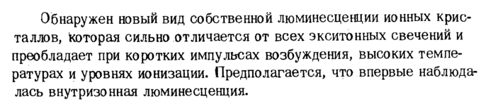 Обнаружен новый вид собственной люминесценции ионных кристаллов, которая сильно отличается от всех экситонных свечений и преобладает при коротких импульсах возбуждения, высоких температурах и уровнях ионизации. Предполагается, что впервые наблюдалась внутризонная люминесценция.