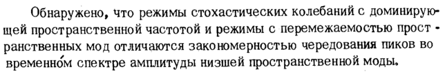Обнаружено, Что режимы стохастических колебаний с доминирующей пространственной частотой и режимы с перемежаемостью прост -ранственных мод отличаются закономерностью чередования пиков во временном спектре амплитуды низшей пространственной моды.