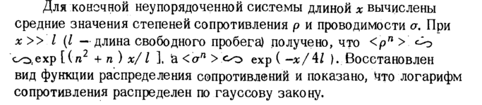 Для коночной неупорядоченной системы длиной χ вычислены средние значения степеней сопротивления ρ и проводимости σ. При х » I (I — длина свободного пробега) получено, что <рп > <^> оо,ехр [(л2 + η ση > со ехр ( — я/4/ (. Восстановлен вид функции распределения сопротивлений и показано, ^то логарифм сопротивления распределен по гауссову закону.