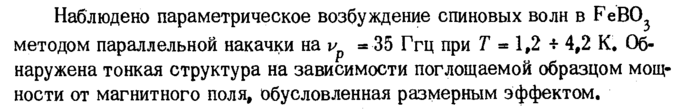 Наблюдено параметрическое возбуждение спиновых волн в FeB03 методом параллельной накачки на ир = 35 Ггц при Τ = 1,2 + 4,2 К» Обнаружена тонкая структура на зависимости поглощаемой образцом мощности от магнитного поля, обусловленная размерным эффектом.