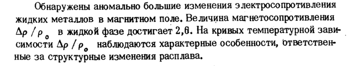 Обнаружены аномально большие изменения электросопротивления жидких металлов в магнитном поле. Величина магнетосопротивления Δρ / р в жидкой фазе достигает 2,6. На кривых температурной зависимости Δρ / ро наблюдаются характерные особенности, Ьтветствен-ные за структурные изменения расплава.
