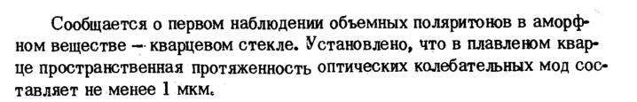 Сообщается о первом наблюдении объемных поляритонов в аморфном веществе кварцевом стекле. Установлено, что в плавленом кварце пространственная протяженность оптических колебательных мод составляет не менее 1 мкмс