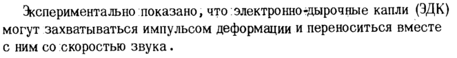 Экспериментально показано, что электронно-дырочные капли (ЭДК) могут захватываться импульсом деформации и переноситься вместе с ним со скоростью звука.