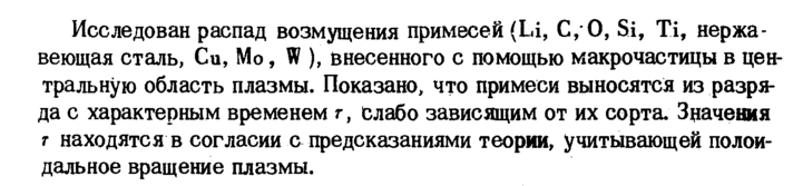 Исследован распад возмущения примесей (Li, С,-О, Si, Ti, нержавеющая сталь, Си, Mo, W ), внесенного с помощью макрочастицы в центральную область плазмы. Показано, что примеси выносятся из разряда с характерным временем г, слабо зависящим от их сорта. Значения τ находятся в согласии с предсказаниями теории, учитывающей полои-дальное вращение плазмы.