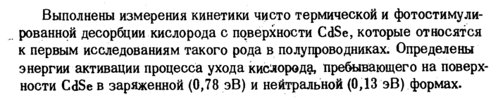 Выполнены измерения кинетики чисто термической и фотостимули-рованной десорбции кислорода с поверхности CdSe, которые относятся к первым исследованиям такого рода в полупроводниках. Определены энергии активации процесса ухода кислорода, пребывающего на поверхности CdSe в заряженной (0,78 эВ) и нейтральной (0,13 эВ) формах.