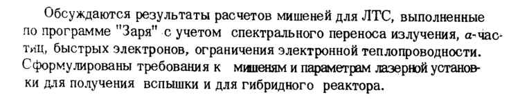 Обсуждаются результаты расчетов мишеней для ЛТС, выполненные по программе п3аря" с учетом спектрального переноса излучения, а-ча& тиц, быстрых электронов, ограничения электронной теплопроводности. Сформулированы требования к мишеням и параметрам лазерной установки для получения вспышки и для гибридного реактора.