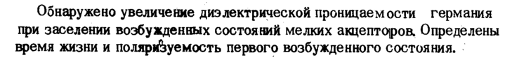 Обнаружено увеличение диэлектрической проницаемости германия при заселении возбужденных состояешй мелких акцептороа Определены время жизни и поляризуемость первого возбужденного состояния.