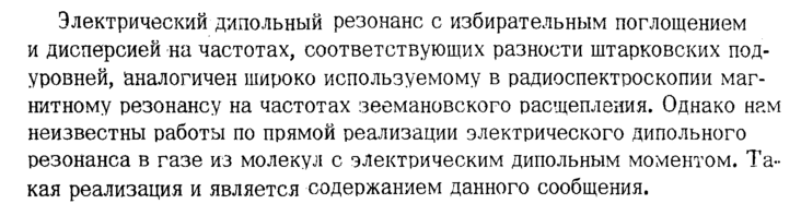 Электрический дипольный резонанс с избирательным поглощением и дисперсией на частотах, соответствующих разности штарковских подуровней, аналогичен широко используемому в радиоспектроскопии магнитному резонансу на частотах зеемановского расщепления. Однако нам неизвестны работы по прямой реализации электрического дипольного резонанса в газе из молекул с электрическим дипольным моментом. Такая реализация и является содержанием данного сообщения.