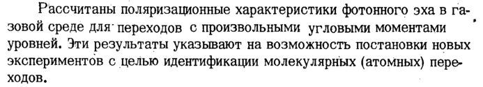 Рассчитаны поляризационные характеристики фотонного эха в газовой среде для- переходов с произвольными угловыми моментами уровней. Эти результаты указывают на возможность постановки новых экспериментов с целью идентификации молекулярных (атомных) переходов.