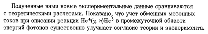 Полученные нами новые экспериментальные данные сравниваются с теоретическими расчетами. Показано, что учет обменных мезонных токов при описании реакции Не4(у, п)Не3 в промежуточной области энергий фотонов существенно улучшает согласие теории и эксперимента.