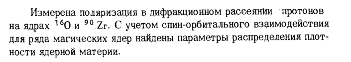 Измерена поляризация в дифракционном рассеянии протонов на ядрах 160 и 90 Zr. С учетом спин-орбитального взаимодействия для ряда магических ядер найдены параметры распределения плотности ядерной материи.