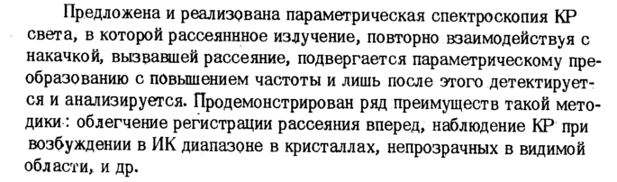 Предложена и реализована параметрическая спектроскопия КР света, в которой рассеяннное излучение, повторно взаимодействуя с накачкой, вызвавшей рассеяние, подвергается параметрическому преобразованию с повышением частоты и лишь после этого детектируется и анализируется. Продемонстрирован ряд преимуществ такой методики: облегчение регистрации рассеяния вперед, наблюдение КР при воз&уждении в ИК диапазоне в кристаллах, непрозрачных в видимой области, и др.