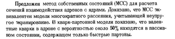 Предложен метод собственных состояний (МСС) для расчета сечений взаимодействия адронов с ядрами. Доказано, что МСС эквивалентен модели многократного рассеяния, учитывающей неупругое экранирование. В кварк-партонной модели показано, что валентные кварки в адроне с вероятностью около 50% находятся в пассивном состоянии, содержащем только быстрые партойы.