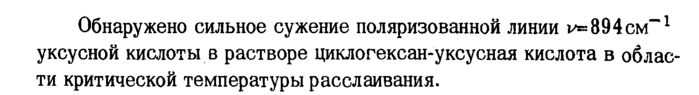 Обнаружено сильное сужение поляризованной линии i/=894cm~1 уксусной кислоты в растворе циклогексан-уксусная кислота в области критической температуры расслаивания.