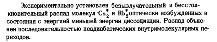 Экспериментально установлен безызлучательный и бессгол-кновительный распад молекул Cs* и Rb* оптически возбужденных в состояния с энергией меньшей энергии диссоциации. Распад объяснен последовательностью неадиабатических внутримолекулярных переходов.