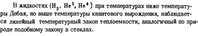 В жидкостях (Н2, Не3, Не* ) при температурах ниже температуры Дебая, но выше температуры квантового вырождения, наблюдается линейный температурный закон теплоемкости, аналогичный по природе подобному закону в стеклах.