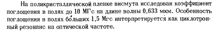 На поликристаллической пленке висмута исследован коэффициент поглощения в полях до 10 МГс на длине волны 0,633 мкм. Особенность поглощения в полях бо'льших 1,5 Мгс интерпретируется как циклотронный резонанс на оптической частоте.