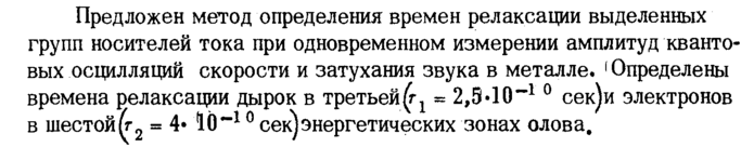 Предложен метод определения времен релаксации выделенных групп носителей тока при одновременном измерении амплитуд квантовых осцилляций скорости и затухания звука в металле. 'Определены времена релаксации дырок в третьей^ = 2,5-Ю"1 0 сек)и электронов в шестой(г2 = 4· It)"10 сек)энергетических зонах олова.