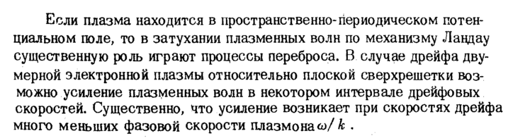 Если плазма находится в пространственно-периодическом потенциальном поле, то в затухании плазменных волн по механизму Ландау существенную роль играют процессы переброса. В случае дрейфа двумерной электронной плазмы относительно плоской сверхрешетки возможно усиление плазменных волн в некотором интервале дрейфовых скоростей. Существенно, что усиление возникает при скоростях дрейфа много меньших фазовой скорости плазмона<у/ к .
