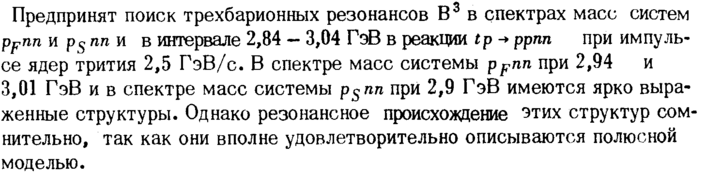 Предпринят поиск трехбарионных резонансов В3 в спектрах масс систем pFnn и psnnw в интервале 2,84 — 3,04 ГэВ в реакции tp -»ррпп при импульсе ядер трития 2,5 ГэВ/с. В спектре масс системы pFnn при 2,94 и 3,01 ГэВ и в спектре масс системы р$пп при 2,9 ГэВ имеются ярко выраженные структуры. Однако резонансное происхождение этих структур сомнительно, так как они вполне удовлетворительно описываются полюсной моделью.